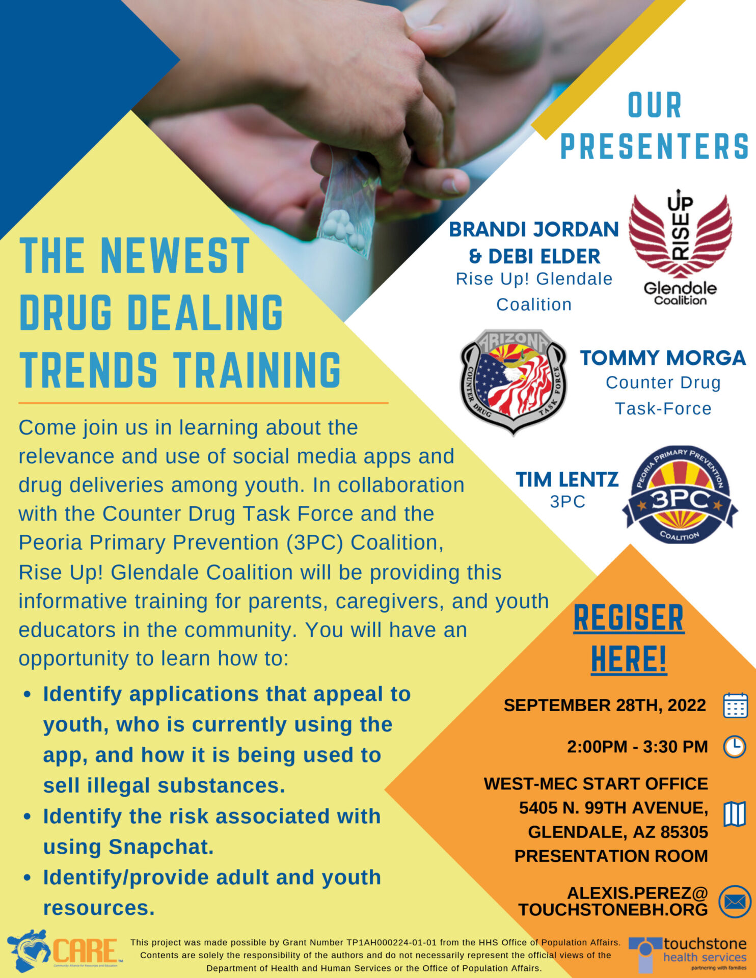 Come join us in learning about the relevance and use of social media apps and drug deliveries among youth. In collaboration with the Arizona Drug Demand Reduction Outreach and the Peoria Primary Prevention (3PC) Coalition, Rise Up! Glendale Coalition will be providing this informative training for parents, caregivers, and youth educators in the community. You will have an opportunity to learn how to: